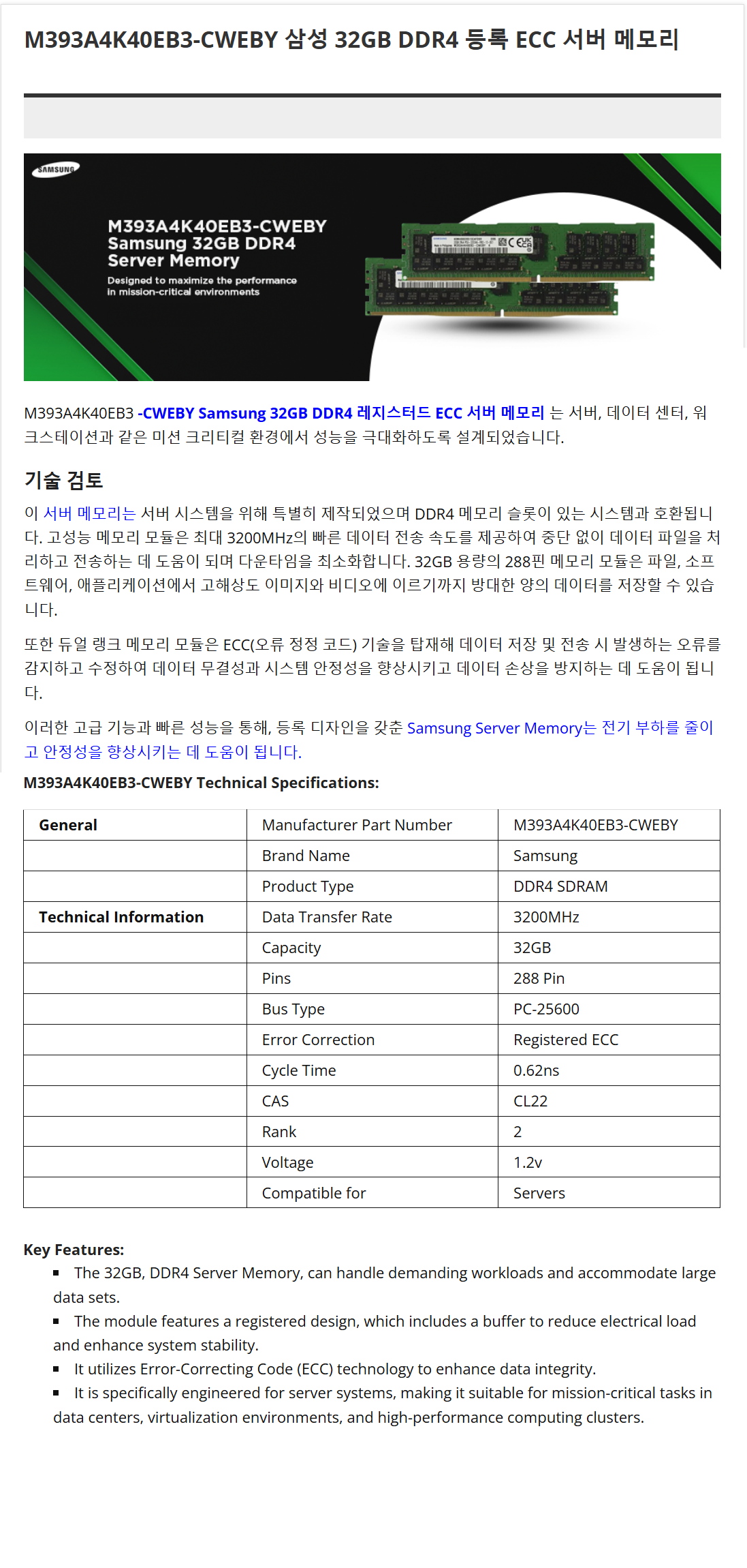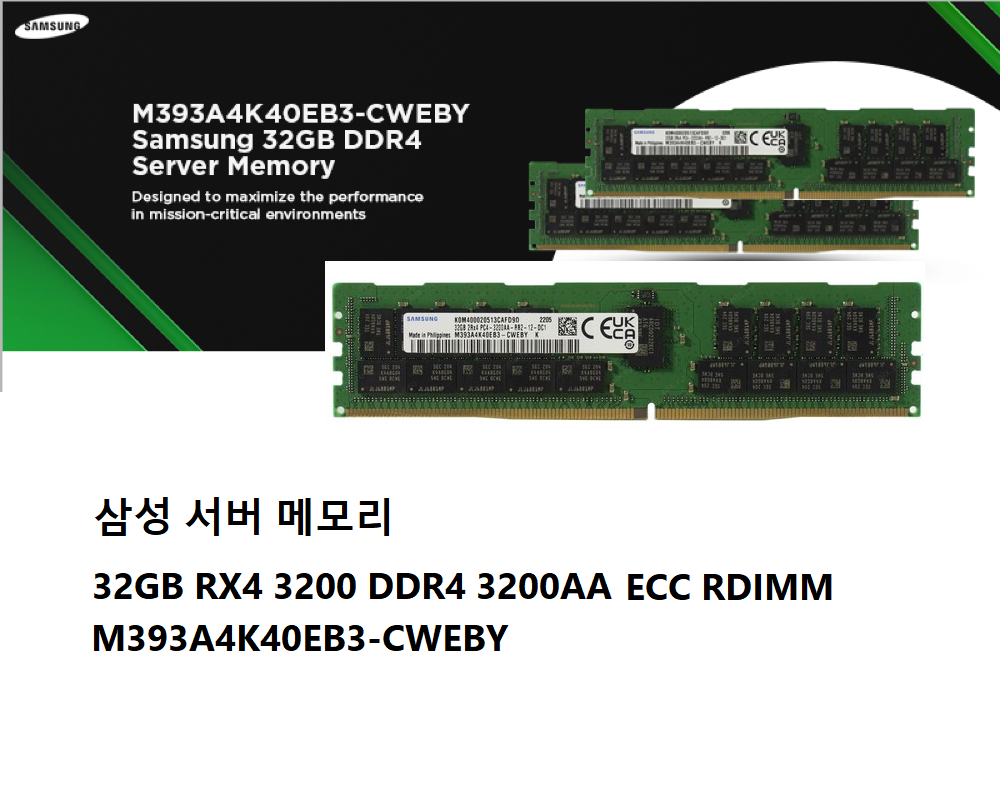 삼성 32GB PC4-25600AA-R DDR4-3200AA-R REGISTERED ECC 2RX4 CL22 서버 메모리