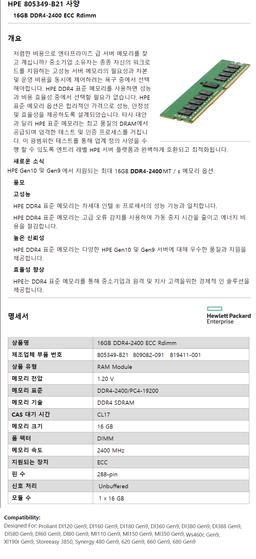 HPE 서버 메모리 805349-B21 16GB DDR4-2400T 809082-091/819411-001